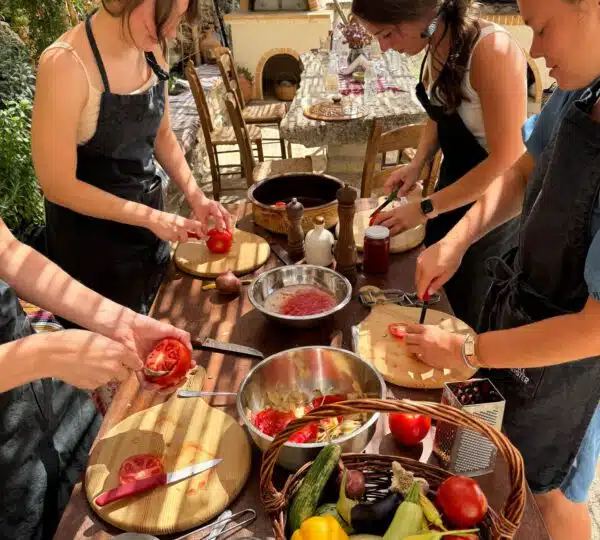 Return to the Veggera, where the table is set with all the dishes you’ve prepared. Enjoy a leisurely meal accompanied by Romeiko wine and lively conversation.
